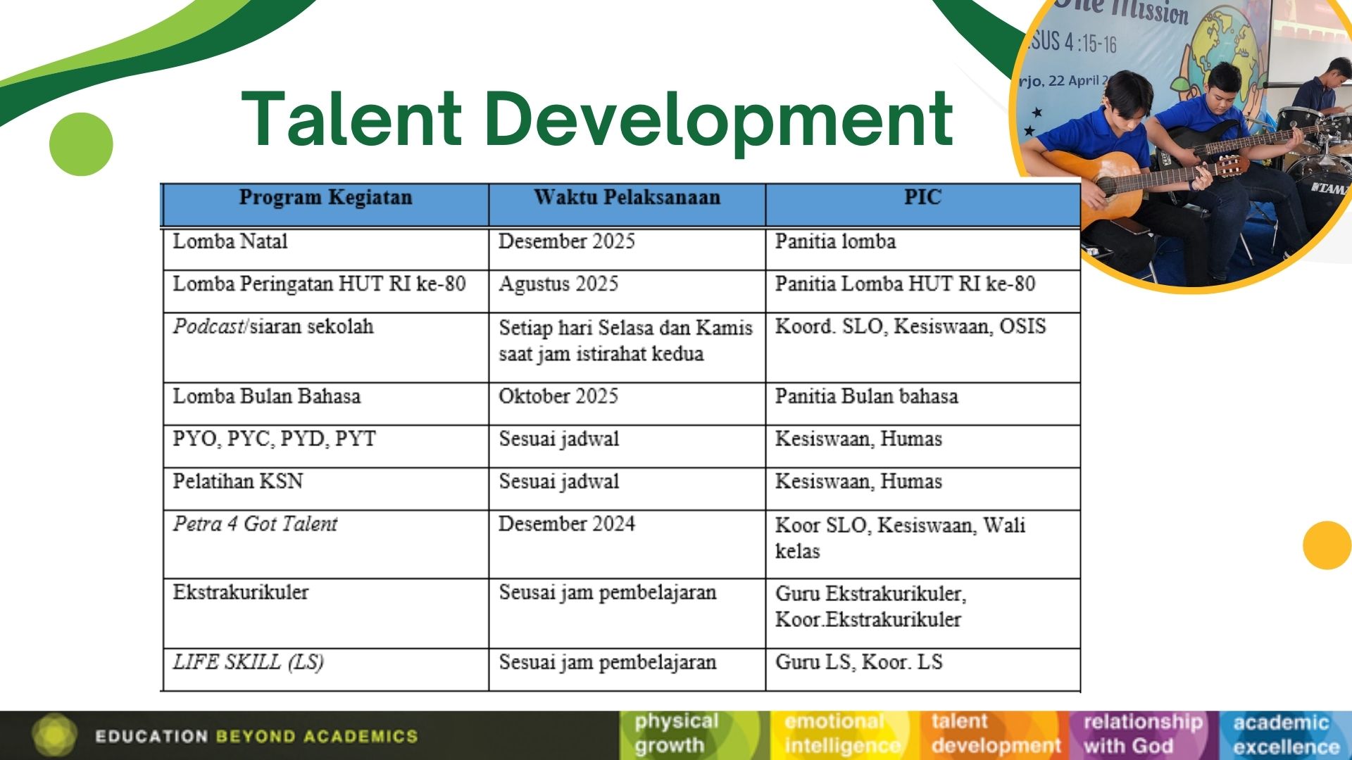 Melalui berbagai upaya tersebut, kami terus mengajak seluruh siswa untuk bertumbuh menjadi pribadi yang tangguh dan adaptif terhadap dinamika zaman. Para guru dan tenaga kependidikan pun secara konsisten mendapatkan pelatihan yang relevan serta bekerja sama menjawab tantangan yang ada demi menciptakan perubahan positif di lingkungan PPPK Petra, khususnya bagi para peserta didik.